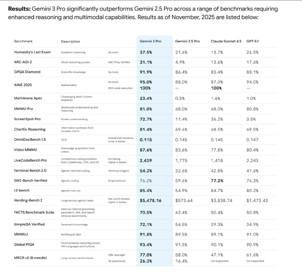 Google wypuściło Gemini 3 Pro — nową modelę SOTA, która już wskoczyła na pierwsze miejsce w LMArena i pewnie wyprzedza GPT-5.1 oraz Claude Sonnet 4.5 w kluczowych benchmarkach.